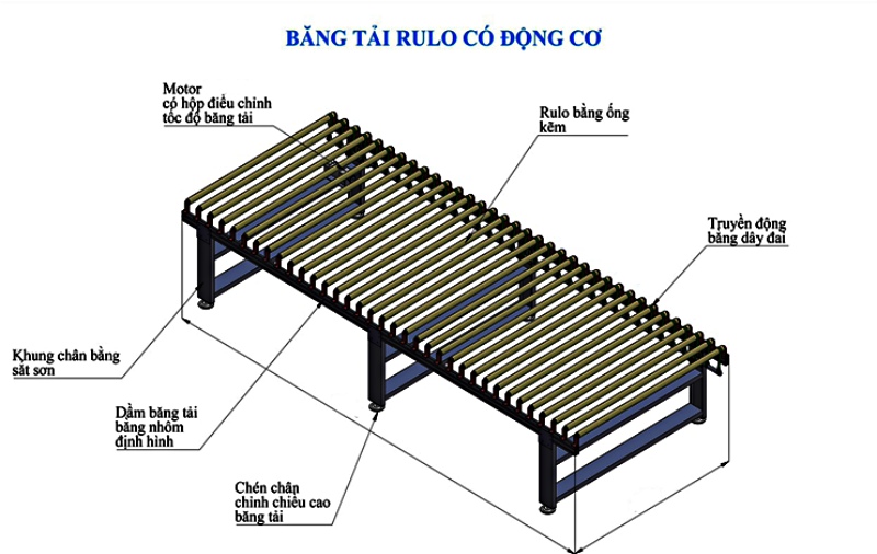 Thông thường 1 băng tải rulo sẽ có 1 động cơ giảm tốc, các rulo, bộ khung băng tải có chân có thể chỉnh độ cao. Động cơ thường được lắp bên dưới băng tải, có thể lắp trực tiếp hoặc truyền chuyển động qua bộ nhông xích đến trục băng tải.